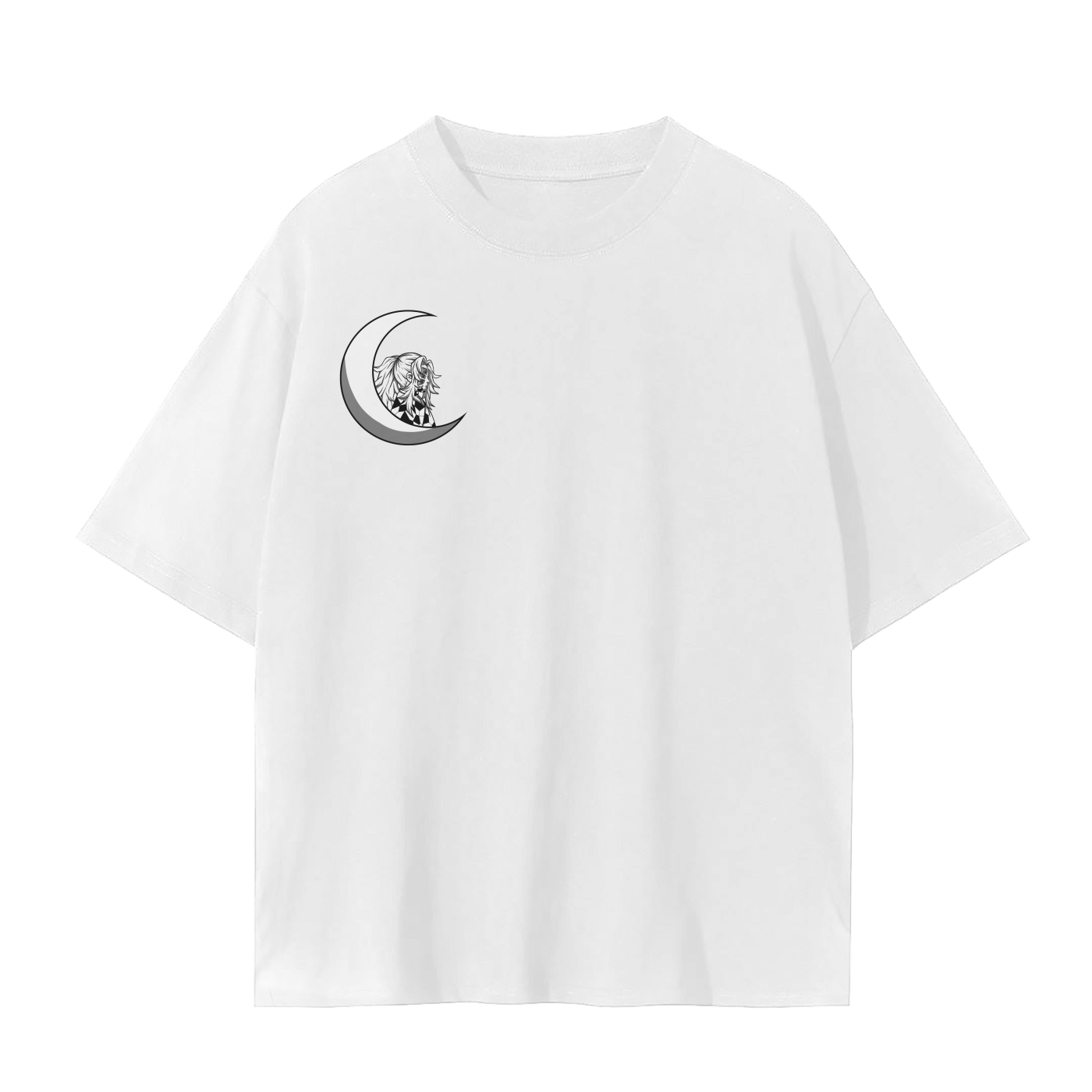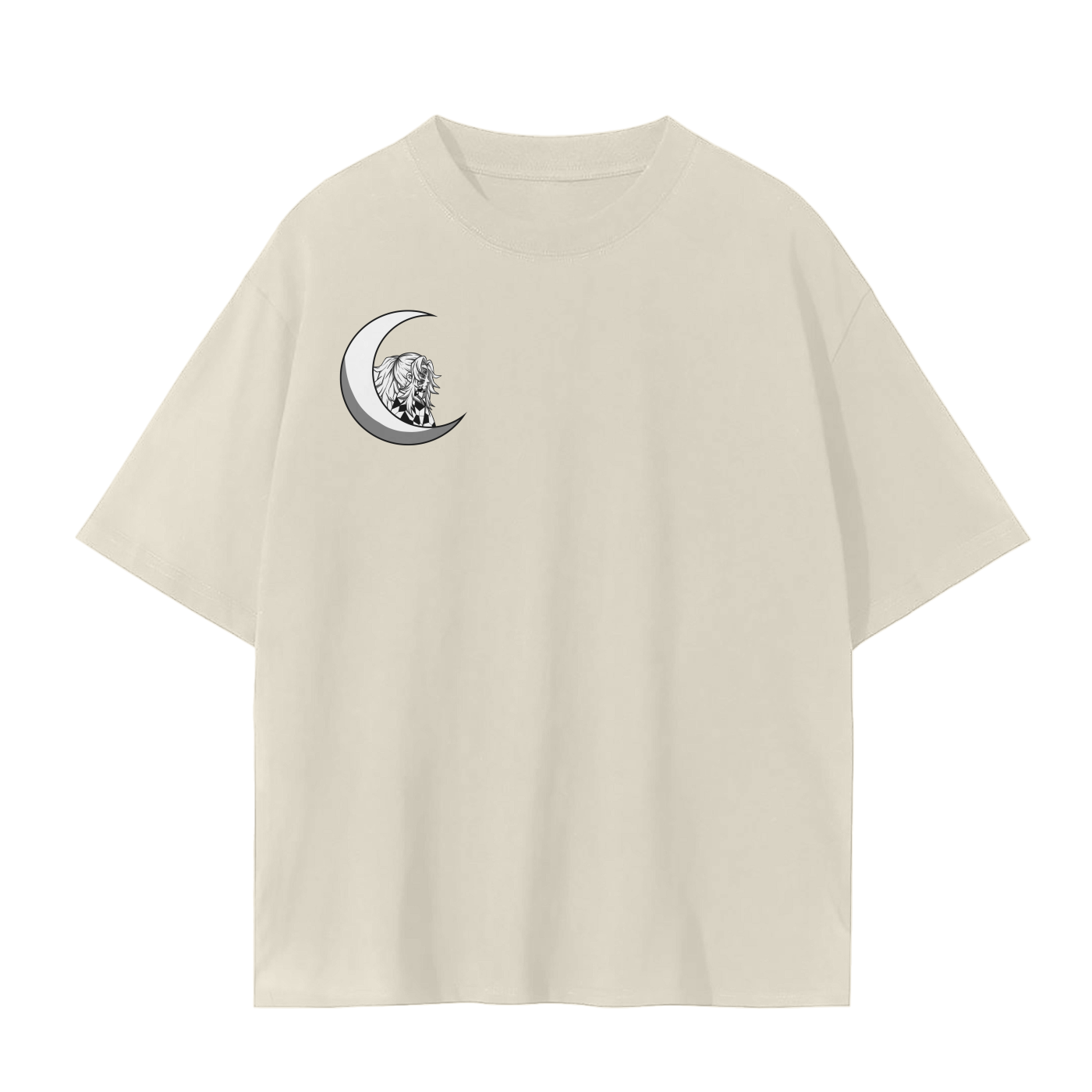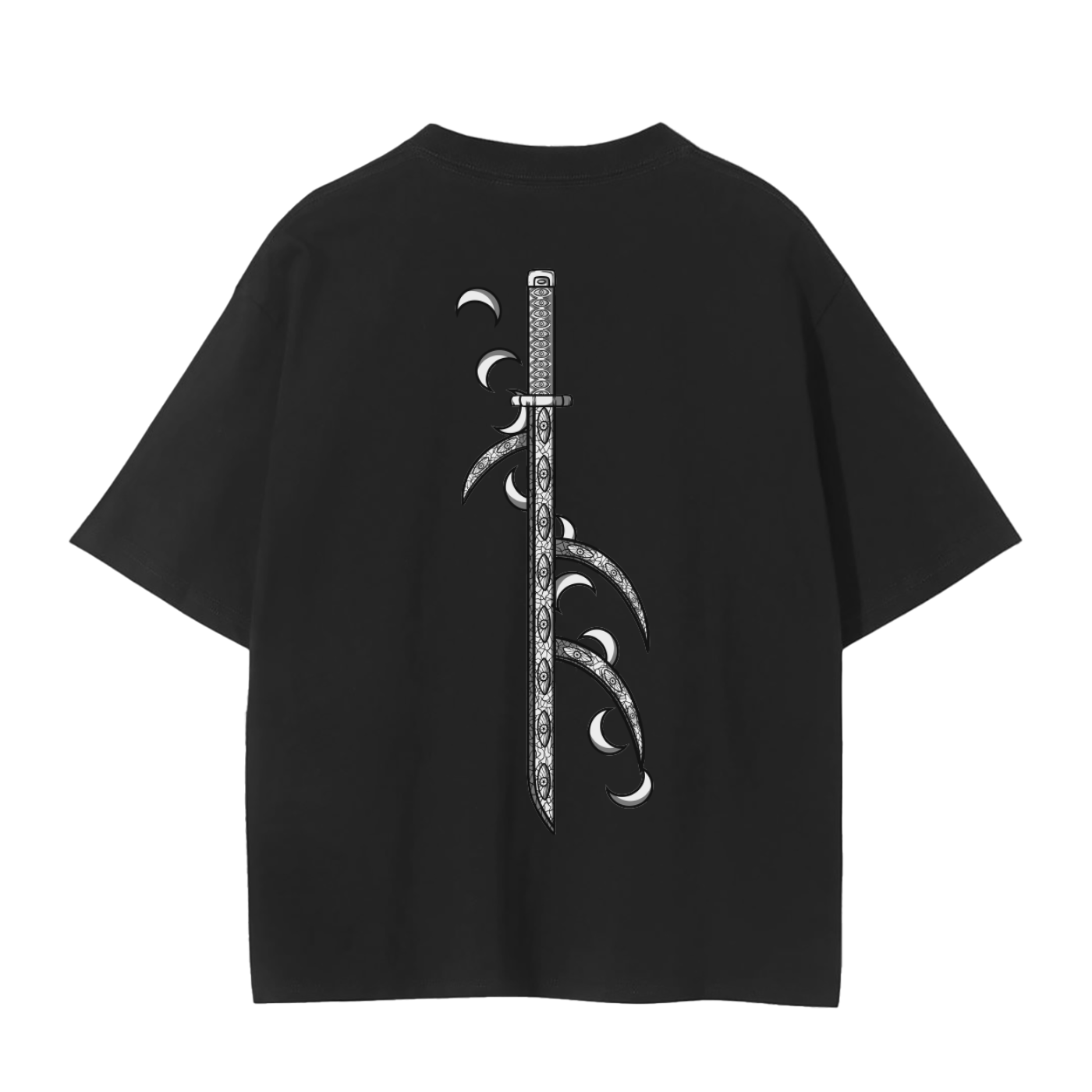 Step into the shadows of the Upper Moon’s legacy. A full-length katana, etched with crescent moons, slashes down the back in bold manga-styled ink, while a minimalist moon crest rests over your heart on the front—silent, ominous, and unmistakably Kokushibo.