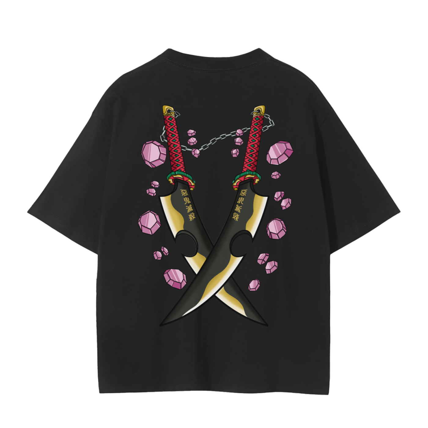Embrace the fearless flash of the Sound Hashira with every wear. Twin katanas cross in dazzling symmetry down the back, framed by glimmering diamonds, while his iconic eye crest rests over your heart on the front—a tribute to Tengen’s bold mantra: “Be flamboyant!”